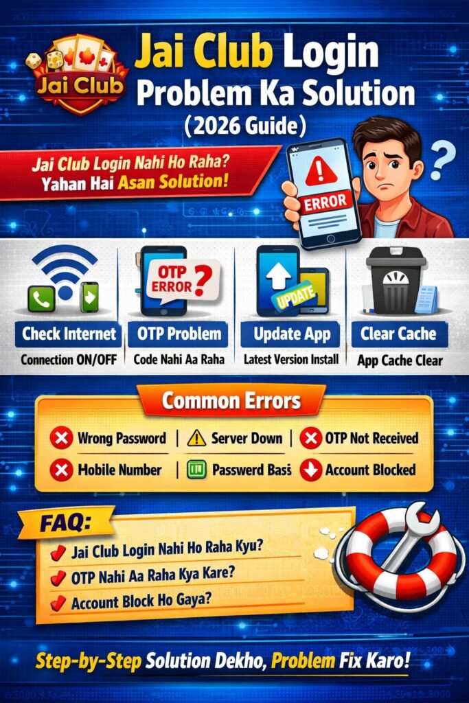 If you are facing a Jai Club login problem, you are not alone. In 2026, many users are experiencing issues like Jai Club login errors, OTP problems, or the app not working. In this guide, we will explain step-by-step how you can easily fix the Jai Club login problem. 🔍 Why Does Jai Club Login Problem Happen? There can be several reasons behind login issues: 👉 Due to these reasons, the Jai Club login not working issue occurs. ✅ Jai Club Login Problem Solution (Step-by-Step) 1. Check Internet Connection First, check your internet connection: 2. Enter Correct Login Details 3. Fix OTP Problem If you are not receiving OTP: 👉 This is the best way to fix the Jai Club OTP problem. 4. Update the App Using an old version of the app can cause issues: 5. Clear Cache 👉 This helps fix the Jai Club app not working problem. 6. Check Server Status Sometimes the issue is not from your side: ⚠️ Common Errors in Jai Club Login Problem Solution OTP not received Change network Login failed Reset password App crashing Update or reinstall app Account blocked Contact support ❓ FAQ (Frequently Asked Questions) Q1. Why is Jai Club login not working? 👉 It usually happens due to internet issues, server downtime, or incorrect details. Q2. What to do if Jai Club OTP is not received? 👉 Change your network or wait for a few minutes. Q3. What if my Jai Club account is blocked? 👉 Contact customer support. 📌 Final Conclusion If you are facing a Jai Club login problem, you can easily fix it by following the steps mentioned above. 👉 Most common solutions: If the issue still persists, you should wait because it might be a server issue. 🔑 Focus Keywords (SEO)